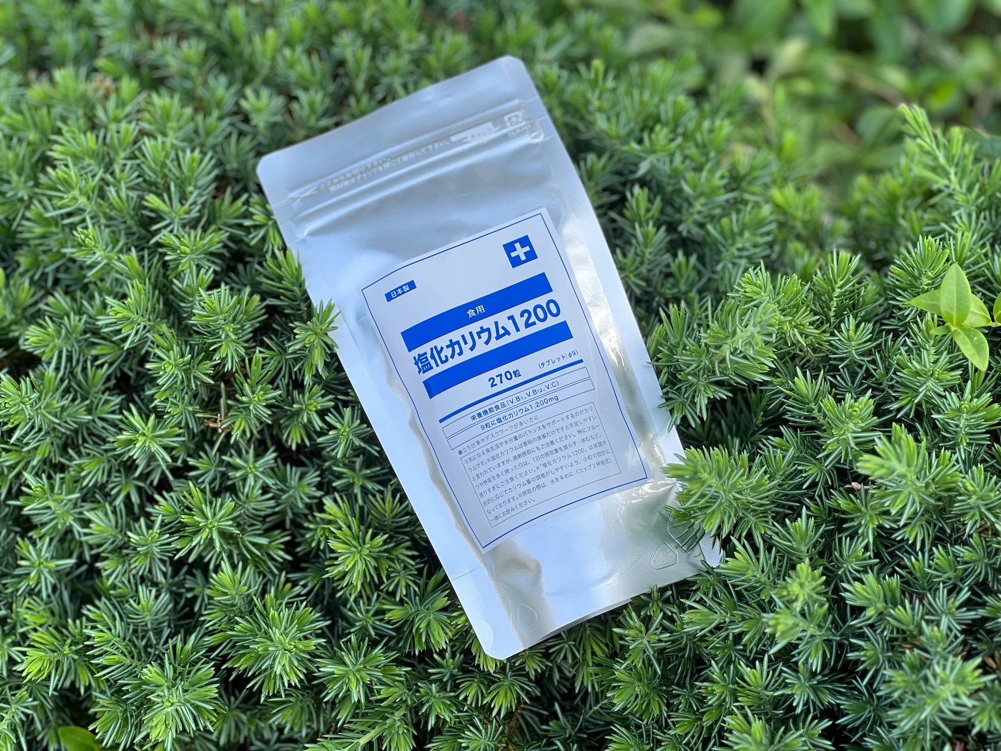・塩化カリウム1200は塩化カリウム (potassium) を1,200mg配合 (1粒あたり134mg) した塩分、水分のバランサーサプリメント・【内容量】86.4g (320mg×270粒) ※1日9粒 (カリウム1,200mg) 30日分 ※1日3粒 (カリウム400mg) 90日分・【原材料名】還元麦芽糖水飴、ヒハツエキス末(デキストリン、ヒハツ輸出物)、赤葡萄葉エキス末/塩化カリウム、セルロース、ステアリン酸Ca、二酸化ケイ素、ヘスペリジン、アラビアガム、ビタミンB12、ビタミンB1、ビタミンC、シェラック・【生産】日本国内GMP認定工場・食生活は、主食、主菜、副菜を基本に、食事のバランスを。・気になる食生活や水分量のバランスをサポートするのがカリウムです。・塩化カリウムは普段の食事だけですと不足しやすいと言われていますが、過剰摂取にもご注意ください。特にフルーツや野菜を多く摂った日は、1日の摂取量を減らす・休むなど、摂りすぎにご注意ください。・「塩化カリウム1200」は体調や目的に応じてカリウム量の調整がしやすいよう、小粒の設計になっております。・摂取の際は、水を多めに(コップ2杯程度)一緒にお飲みください。