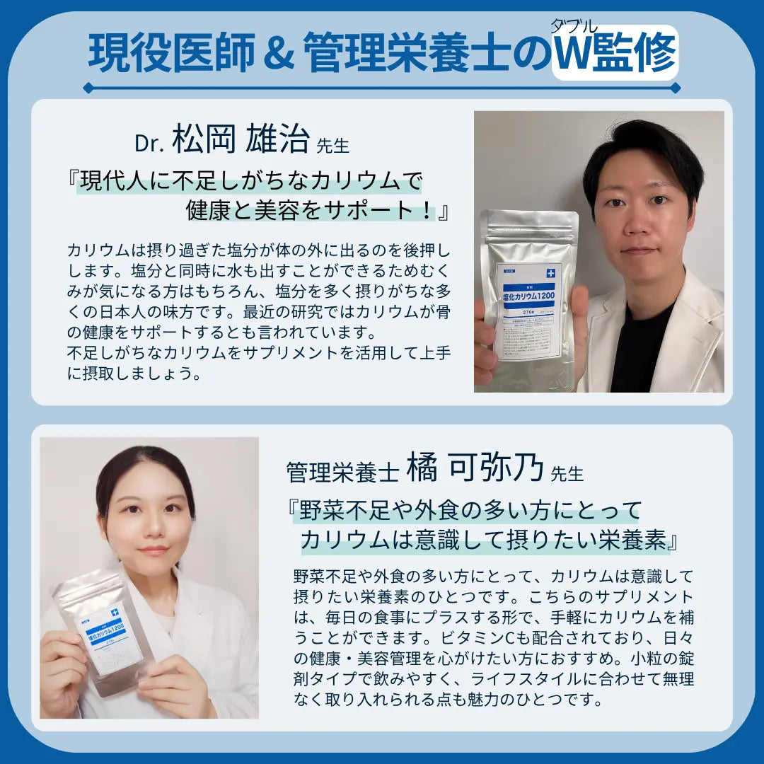 POTENIA塩化カリウム1200は、現役医師、管理栄養士さまによる監修を受けて開発されたカリウムサプリです。着色料、防腐剤などは不使用のまま、こだわり抜いた成分配合と品質を実現いたしました。