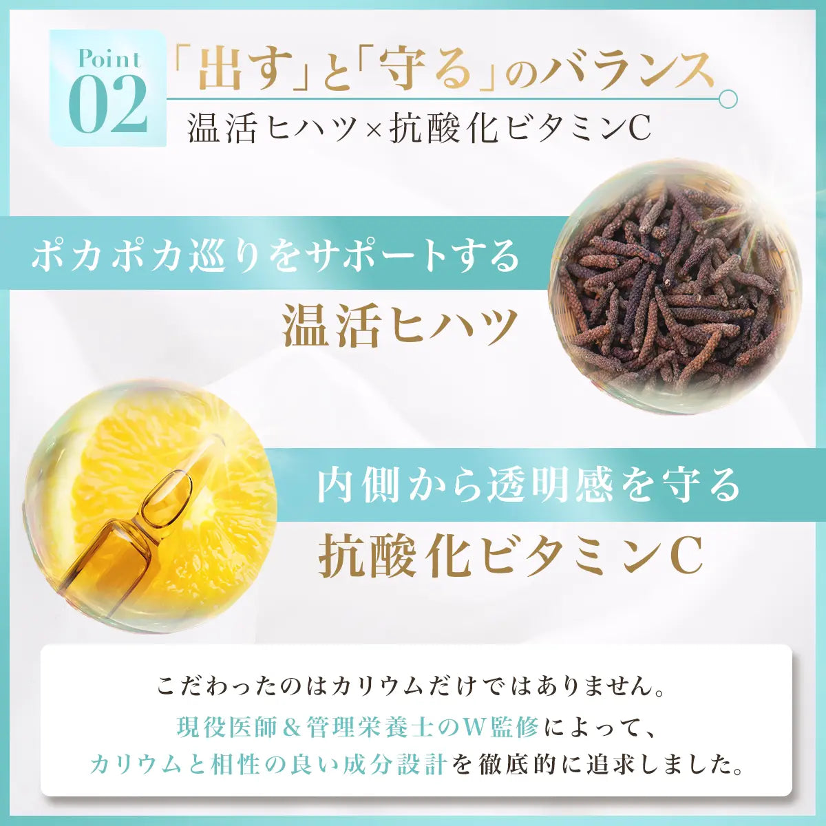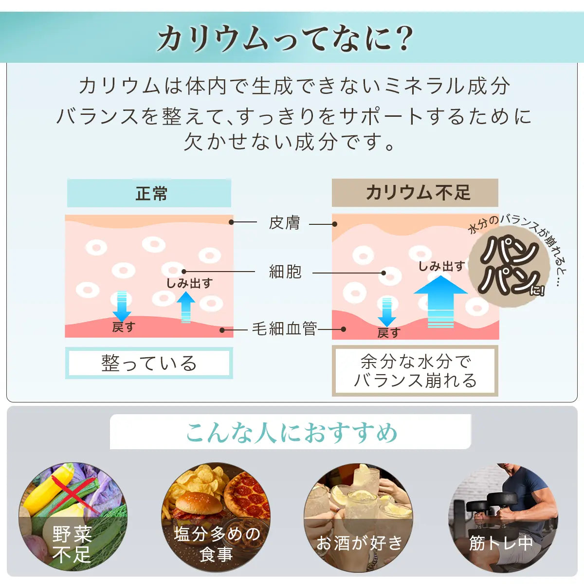 ※カリウムの過剰摂取は腎臓に負担をかけるため、量を調整しやすくするために小粒設計にしております。 - ビタミンC・B1・B2配合